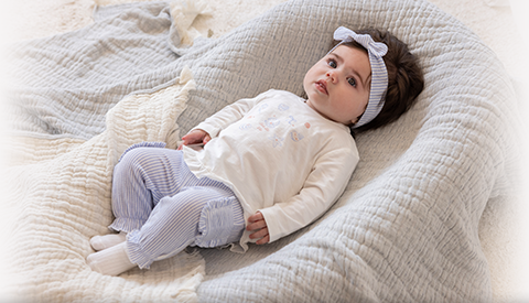 Perlmuttfarbene Schalen und Schleifen, zartrosa, ecru AOP (+ Badebekleidung) und lavendelblauer Strukturstreifenstoff.