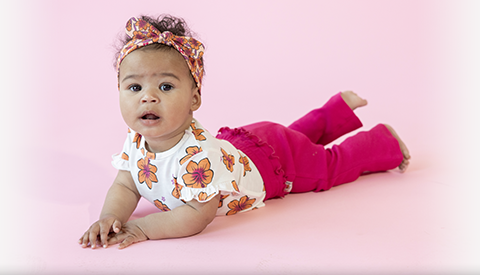 „Aloha, meine Lieben! Fuchsia, Pfirsich und lila Hibiskus-Allover-Muster (+ Badeanzug) und fröhliche Frottee-Mehrfarbstreifen.
